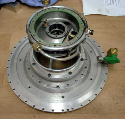 the compressor cover/bearing housing assembly. This is one of the most complicated parts of the whole turbine engine because it contains the complete lubrication system for the single hydrodynamic