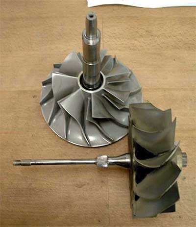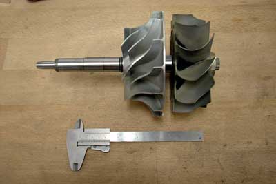 KKK turbocharger spares. The compressor bore is enlarged to accept the thick shaft required for the cantilevered suspension arrangement. To prove the compressor hub is still strong enough, Andreas had the wheel